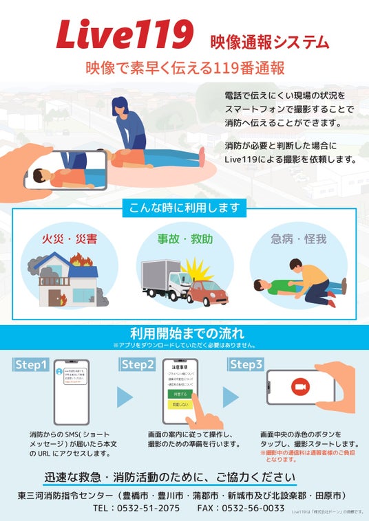 豊橋市など愛知県東部の東三河5市で共同運用している東三河消防指令センターは2025(令和7)年5月1日(木)から、119番通報者と同センターの間で映像を送受信できる映像通報システム「Live119」の運用を始めます。