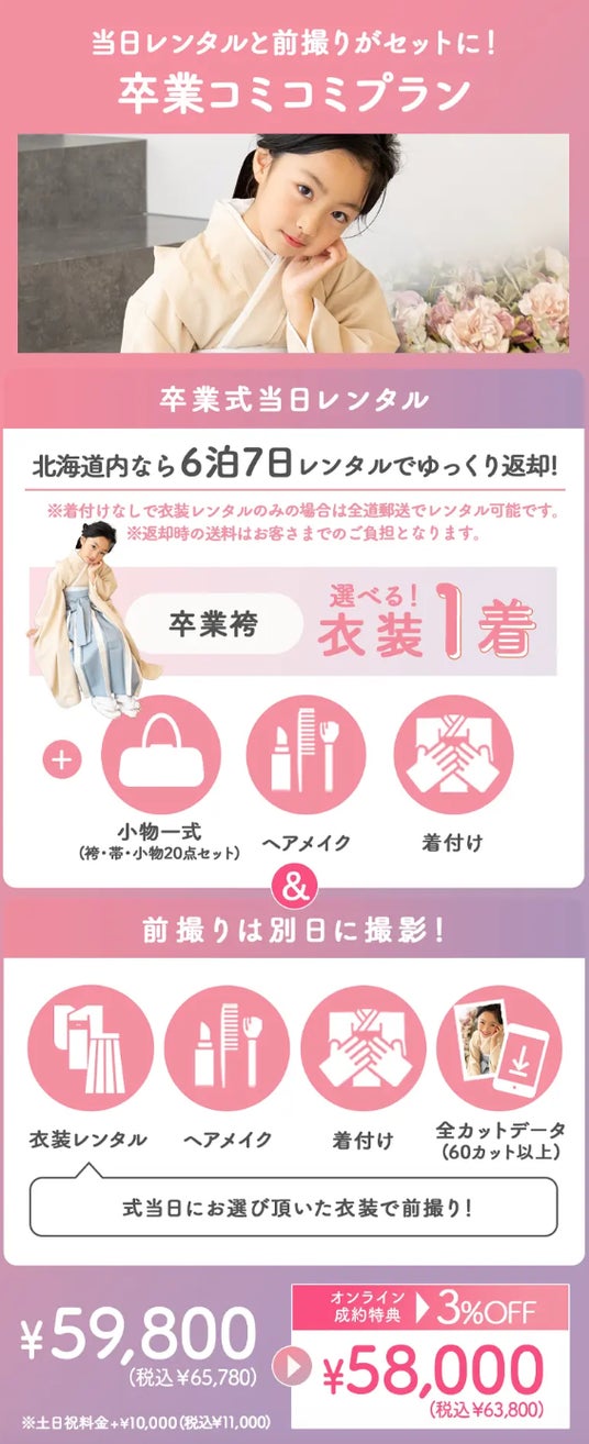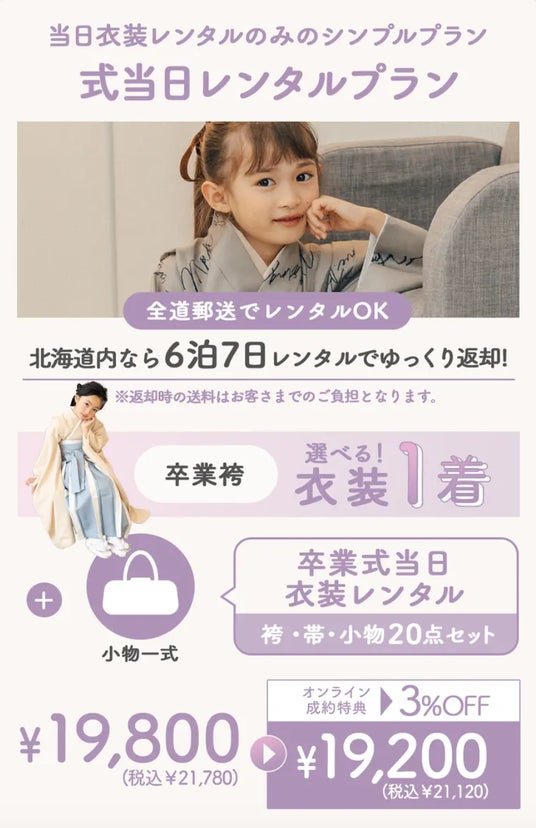 小学生袴プランの受付は写真工房ぱれっとサッポロファクトリー店限定で札幌市外でもご利用いただける様、レンタル発送も全道対応で受付します。