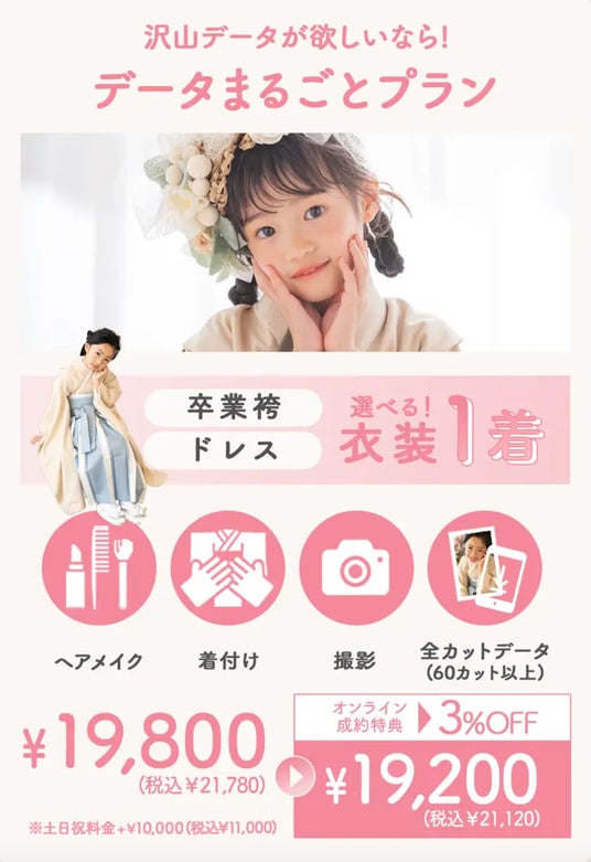 「撮影だけ楽しみたい」「当日に着ていきたい」など、お客様のご希望に合わせた3つのプランをご用意しております。お値段は税込21,780円~。