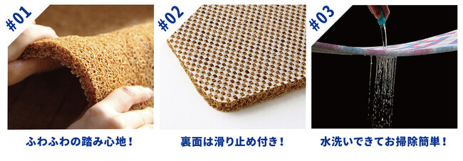 マットは糸状のPVCを固めて形成。ふわふわなのにしっかり弾力がある踏み心地です。裏面に滑り止め付きでズレにくく安定感があり、通気性と水はけが良く、汚れても水で丸洗いできます。
