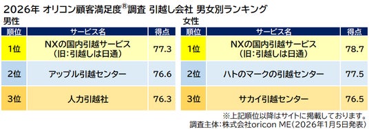 『引越し会社』男女別ランキング(2026年 オリコン顧客満足度(R)調査)