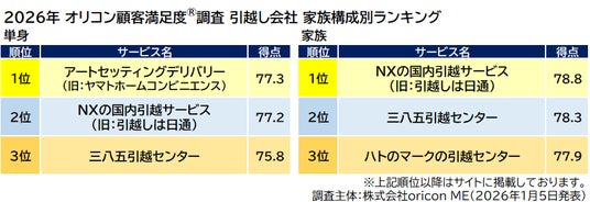 『引越し会社』家族構成別ランキング(2026年 オリコン顧客満足度(R)調査)