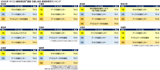 『引越し会社』都道府県別ランキング(2026年 オリコン顧客満足度(R)調査)