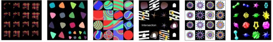 (写真左から)青木優太「crossover」・アラカワケンスケ「morph」・倉橋真也「Tip of the Iceberg」・センバク「交差点」・田島琢巳「quantum entanglement(量子もつれ)」・広岡ジョーキ「Busy Primitives」