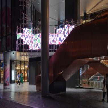 Shibuya Sakura Stage「INTER-SQUARE」Shibuya Sakura Stageに設置されたスクエア型ユニットによるビジョン群を一体としたメディアファサード。渋谷の新たな表現を育むデジタルスクエアとして、新たなデジタルアートの社交場となることを目指している。メディアファサードを表現者に解放することで、渋谷の多様で刺激的な文化発信の一翼を担っている。