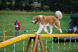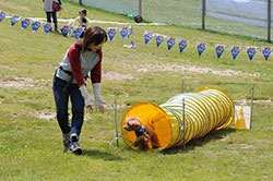 「よ~いドン」でスタートして、コの字型に配置された簡単な障害物をクリアして、ゴールのテーブルに戻るまでのタイムを競います。クリア できないポイントはパスすることが出来るためドッグスポーツ初心者におすすめの競技です。
