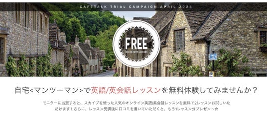 https://cafetalk.com/campaign/monitor-extra/language/english/apr2024/?lang=jaモニターに当選すると、スカイプまたはZoomを使ったオンライン・マンツーマンのレッスンを無料で試せるチケット(最大3,300円までのレッスンに使用可能)を2回分進呈。さらに、レッスン受講後に口コミを書いてお知らせいただくと、もう1回分ご受講チケットをプレゼント。3回、最大9,900円分のレッスンを無料でお試しいただく人気企画になります。
