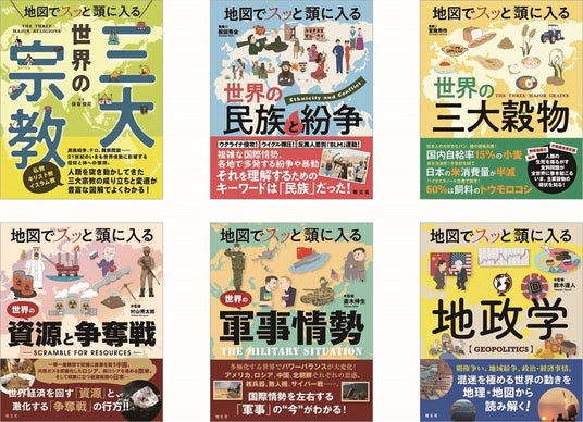 <上段左から「世界の三大宗教」「世界の民族と紛争」「世界の三大穀物」、下段左から「世界の資源と争奪戦」「世界の軍事情勢」「地政学」>