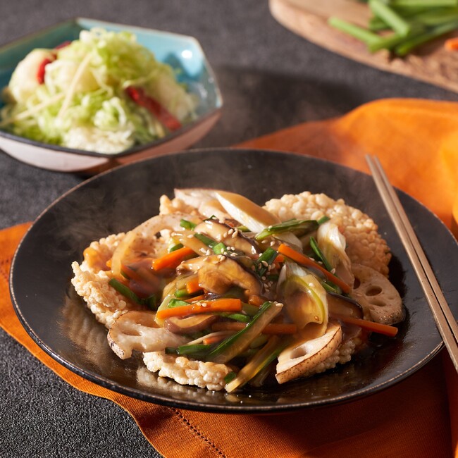 香ばしくパリッと仕上げたおこげに野菜たっぷりのあんをかけて、あつあつでお楽しみください。