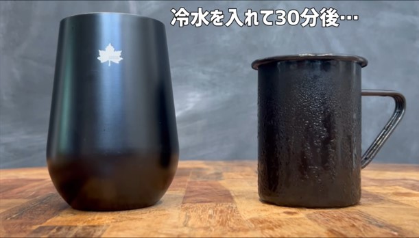 真空ステンレス構造により、熱い飲み物を入れても表面が熱くなりにくく、氷水を入れても結露が発生しにくい。