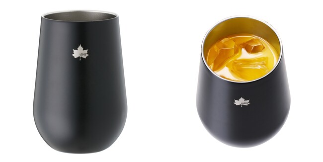 容量は350ml缶を1本丸ごと入れるのに最適な390mlで、缶ビールやチューハイやジュースをぴったり注げるサイズです。本体ボディは黒のメインカラーの中に、ワンポイントで白のメイプルリーフをあしらったシンプルなデザインで、幅広いシーンでお使いいただけます。