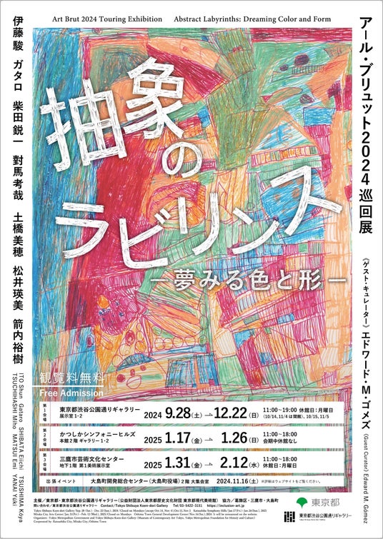 東京都渋谷公園通りギャラリーは、東京都とともに、アール・ブリュット*2024巡回展「抽象のラビリンス ―夢みる色と形―」を都内3会場において開催いたします。〈第1会場〉東京都渋谷公園通りギャラリー(2024年9月28日~12月22日)を皮切りに、〈第2会場〉かつしかシンフォニーヒルズ(2025年1月17日~1月26日)、〈第3会場〉三鷹市芸術文化センター(2025年1月31日~2月12日)と巡回します。ぜひお近くの会場で、アール・ブリュットの魅力に出会い、作品が発するメッセージを感じてみてください。