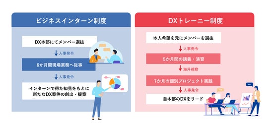 ・ビジネス・デジタル双方を理解する「DXビジネス人材」の育成へ向け、人事異動を伴う新DX人材育成制度「ビジネスインターン制度」「DXトレーニー制度」を開始。