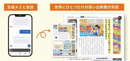 お子様が遊んだ場所についての感想や楽しかった思い出について生成AIと対話をすることで、自動で見出しや記事本文が作成され、世界にひとつだけの思い出新聞が完成