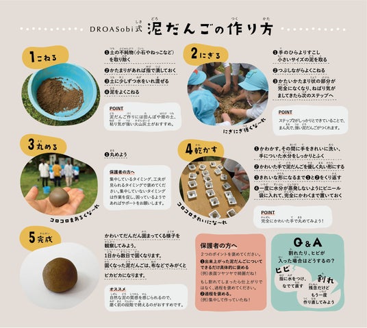 「DROASobi~どろのふしぎ体験プログラム~」についてでは、講話やクイズ形式で生活に身近な泥を知るところから、泥だんごづくりまで五感を使って泥にふれあいます。自分なりの工夫をして泥だんごをつくることや、互いに誉めあうこと、自然を理解することなど全体の体験を通して「自己肯定感」「主体性」「コミュニケーション能力」の向上に貢献します。