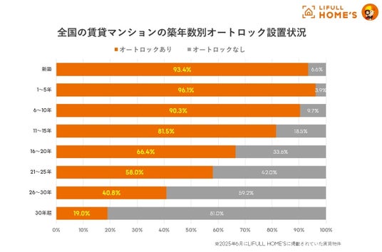 また、オートロックが設置されているマンションの割合も築年数別に調査すると宅配ボックスと同様に基本的には築年数の若い物件の方が設置率が高い傾向にあり、築15年以下の物件では8割以上がオートロックありとなっています。