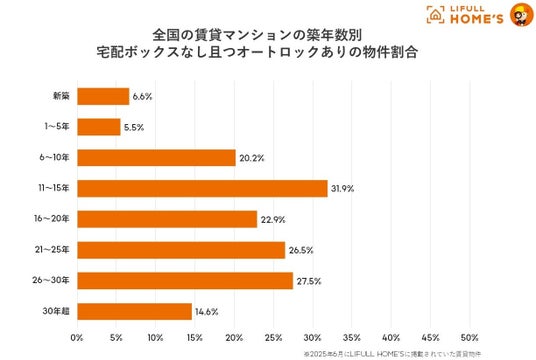 築10年超の物件では約半数、築30年超の物件では9割が宅配ボックスなし