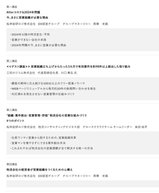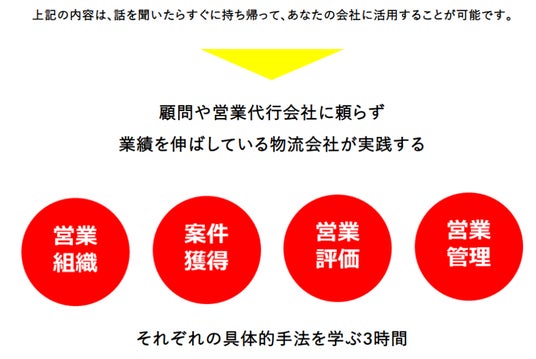 営業組織を立ち上げて業績を伸ばしているゲスト企業が登壇し、「たった5カ月で98件の新規荷主問い合わせ」を獲得した営業組織作りのノウハウについて解説していただきます。