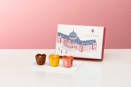 ブランド代表作『チューリップローズ』のスペシャルボックス。駅舎を手書きで描いた、温かみのある JR 東京駅限定デザインです。