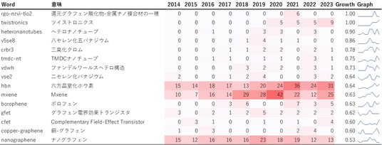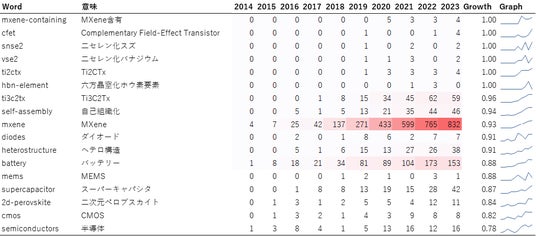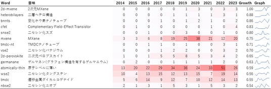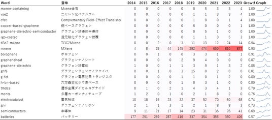 特許同様にMXene、TMDC関連の用語や半導体関連のキーワードが伸びていることに加え、「nanographene」や「tmdc-nt」、「heteronanotube」といったようなナノ構造化材料に着目したキーワードが増加しています。このことから、低次元材料の新規開発に加えて、構造制御に関する分野に注目が集まっているといえます。