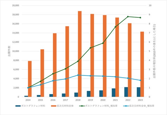低次元材料全体では、2018年まで大きく増加している一方、2019年以降はわずかながら減少傾向にあります。その一方、ポストグラフェン材料は、件数自体は低次元材料全体の1割程度であるものの、2014年以降、つねに増加傾向にあります。2015年の出願数を1とした場合、特許数全体では、1.8倍から2.4倍の間で大きな増減は見られない一方、ポストグラフェン材料に限定した場合は約8.5倍に増加しています。このことから、低次元材料の現在の技術は、全体においては産業レベルで技術的に成熟レベルにあり、ポストグラフェン材料については実用化にむけた開発が進みだしていることがうかがえます。