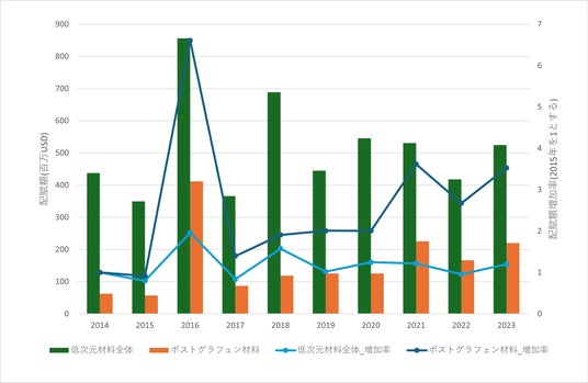 低次元材料全体でみると、2016年の大きなピーク以降、大きな増加は見られません。2018年以降は2014年の1.0倍から1.5倍程度の研究資金が安定して投入されていることがうかがえます。