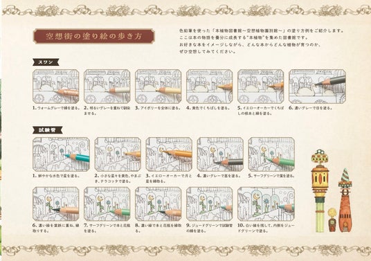 空想街ならではの色づかい、彩色テクニックも多数紹介し、作品ギャラリーとしても楽しめる一冊。空想街ファンも、大人の塗り絵ファンも、はじめての方も、ぜひ最新刊『空想街雑貨店の季節をめぐる旅する塗り絵』にご注目ください!