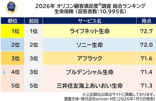 『生命保険』総合ランキング(2026年 オリコン顧客満足度(R)調査)