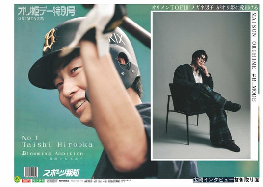 プロ野球オリックスのタブロイド新聞「オリ姫デー2025特別号」(オールカラー24ページ+抜き取り8ページ、税込み600円)を、26日から発売します。オリメン投票ランキング・トップ10の全選手を、今年のコンセプト「メガネ男子」の写真や、本紙カメラマンが撮影したスペシャルショットで掲載。抜き取り紙面では、同投票で初の1位に輝いた広岡大志内野手の単独インタビューを掲載します。「Bs SHOP」(京セラドーム大阪内)、「B-WAVE」(神戸・三宮)などのほか、30日午前8時からはスポーツ報知大阪販売局サイト(https://hochi-osakahanbai.com/)でも購入できます。
