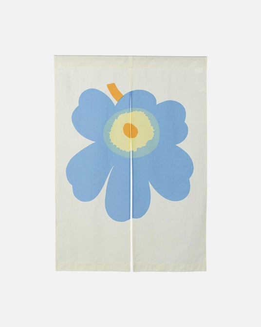 今回は、そのようなマリメッコを代表するプリント 「ウニッコ」が日本の伝統文化である暖簾にデザインされて登場します。生成りのコットンをベースに、爽やかなスカイブルーと温かなライトイエローで彩られたウニッコを中央に配置。日本家屋に馴染む落ち着いた風合いでありながら、モダンな空間にも自然と溶け込み、様々な場所でお使いいただけるアイテムです。