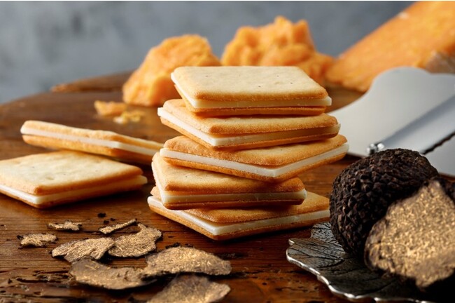 北海道産牛乳とチェダーチーズ、トリュフを混ぜ込んだクッキーに、トリュフ風味のチョコレートをサンドしました。世界三大珍味の1つであるトリュフを使用した、プレミアムなクッキーです。