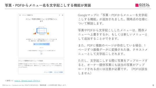ほかにも「写真・PDFからメニュー名を文字起こしする機能が実装」などローカルSEO担当者必見の情報が満載!