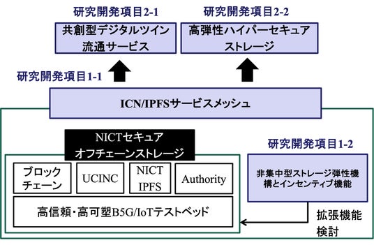 そして、研究開発項目 2 として、研究開発項目 1 の仕組みを用い、NICTセキュアオフチェーンストレージの上で共創型デジタルツインサービス及び非集中型アプリケーションを構築します。これら 2 つの非集中型アプリにおいてセキュアかつ効率的なデータ流通が可能となることを検証します。