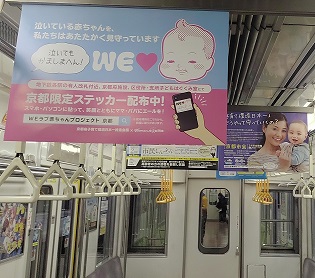 「京都府子育て環境日本一推進会議」では、公共の場で泣き始めた赤ちゃんを早く泣き止ませようと懸命にあやしているママ・パパに、周囲が「泣いても気にしませんよ」という受容の気持ちを示す「WEラブ赤ちゃんプロジェクト」を実施しています。