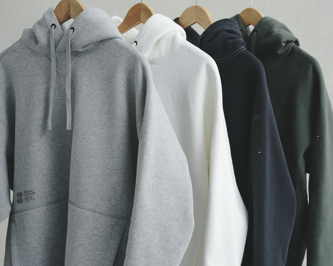 袖付けは、前はセットインスリーブ、後ろはラグランスリーブのスプリットラグランスリーブ。腕の動かしやすさとシルエットの美しさを目指したパターンです。フーディはかぶり心地と立ち上がりの美しさにこだわっています。パンツも、レギュラーフィットは程よくゆとりがあるスマートなテーパードシルエット、オーバーサイズフィットは腰や腿はゆとりがありながらも裾まわりはすっきりさせたシルエットです。