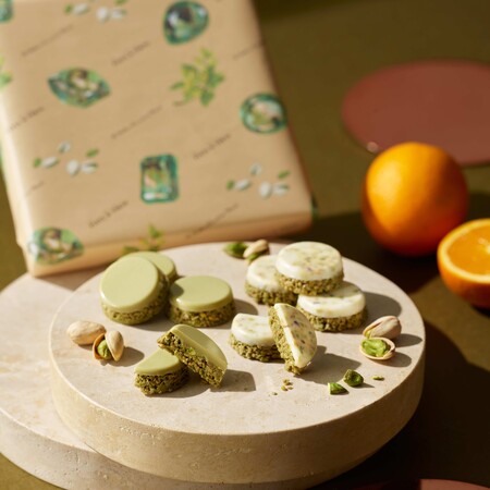 ピスタチオづくしの2層クランチ「ピスタチオ&ピスタチオ」と、ピスタチオとオレンジのクランチにピスタチオを閉じ込めたホワイトチョコレートの2層クランチ「ピスタチオ&オレンジ」の詰め合わせです。