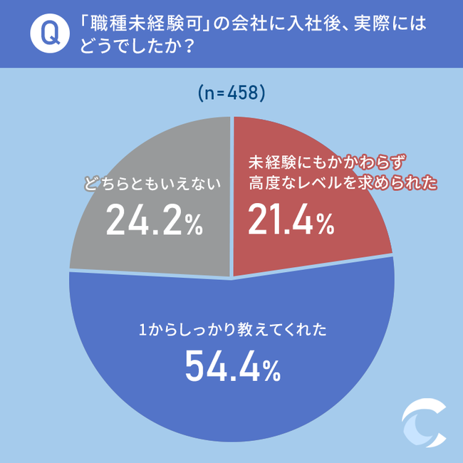 54.4%と半数以上の方が「1からしっかり教えてくれた」と回答した一方で、「未経験にもかかわらず高度なレベルを求められた」という方も21.4%いました。