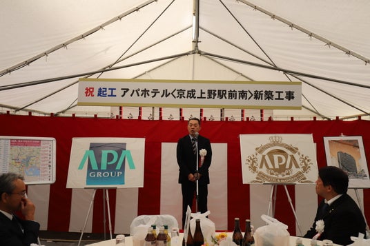 神事後の挨拶において、アパグループ社長 兼 最高経営責任者(CEO)の元谷 一志は、「上野・浅草は観光客や訪日外国人旅行者が多く集まるエリアであり、多くの宿泊需要が見込める。一方で一極集中ではなく多極分散で政令指定都市の20都市のうち18都市に直営ホテルを営業しており、今後も選択と集中を意識し、変容していく社会に対応していきたいと思う。また、訪日外国人に対して高機能・高品質・環境対応型のアパ仕様を意識しつつ、日本らしい姿勢を大切にしていきたい」と述べた。