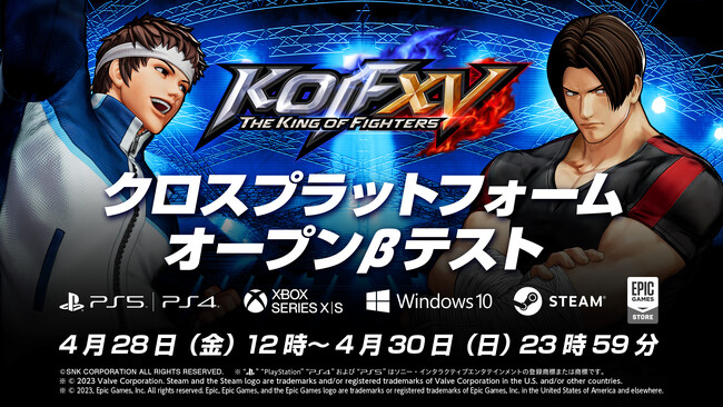 株式会社SNK (本社:大阪府大阪市、代表取締役社長 CEO:松原 健二)は、PlayStation(R)5/PlayStation(R)4/Xbox Series X|S/Windows 10/Steam/Epic Gamesストアで好評発売中の対戦格闘ゲーム『THE KING OF FIGHTERS XV(KOF XV)』について、4月28日(金)12時から4月30日(日)23時59分まで、クロスプラットフォーム機能のオープンβテストを実施することをお知らせいたします。