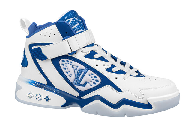 スムースカーフレザーとグレインカーフレザーを組み合わせ、ルイ·ヴィトンのモノグラムパターンがエンボス加工されたスニーカー。ヴィンテージのバスケットボールスニーカーからインスピレーションを得て、 デザインされました。モノグラム・フラワーをあしらったラバーアウトソールをアッパーがデザインポイントです 。