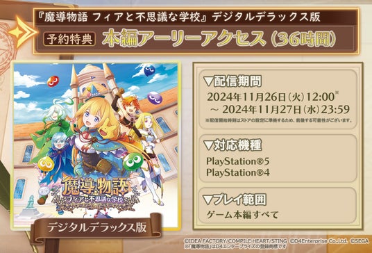 アイディアファクトリー株式会社(代表取締役社長:佐藤 嘉晃/所在地:東京都豊島区)の子会社である株式会社コンパイルハート(取締役社長:冨長 直人/所在地:東京都豊島区)は、PlayStation5/PlayStation4版『魔導物語 フィアと不思議な学校』のデジタルデラックス版のアーリーアクセスを開始いたしました。