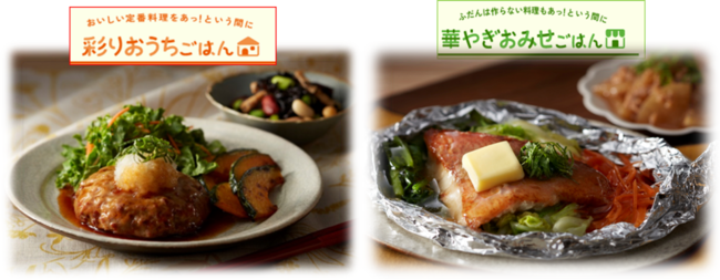 献立は、「彩りおうちごはん」と「華やぎおみせごはん」の2つのコースからお選びいただけます。「彩りおうちごはん」は、家族みんなが好きな定番料理を、「華やぎおみせごはん」は、家ではなかなか作らないお店で食べるような料理を揃えております。