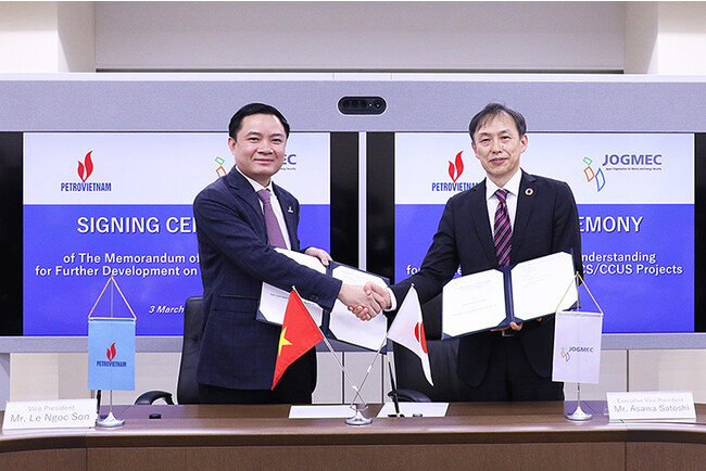 JOGMEC(本部:東京都港区、理事長:細野 哲弘)はベトナム国営石油会社(以下「ペトロベトナム」、社長兼CEO:Le Manh Hung)との間で覚書(Memorandum of Understanding、以下「MOU」)を締結し、ベトナムにおけるCCS/CCUS事業のための共同調査を次のフェーズへ移行するため、協議を進めていくことで合意しました。