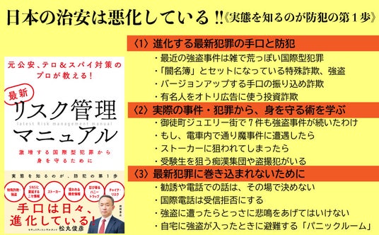 各テレビやメディアでも最新の凶悪犯罪や海外トラブル事案を分析、防犯対策をアドバイスしているセキュリティコンサルタント・松丸俊彦氏の著書、『最新リスク管理マニュアル』を5月30日(木)に発売いたします!