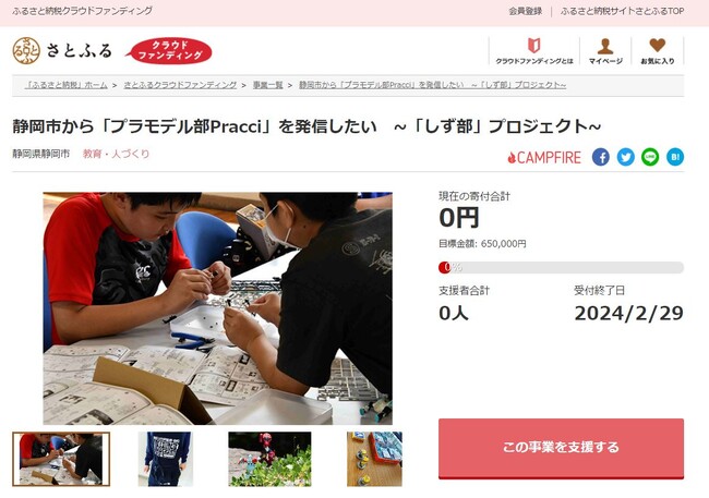 プラモデル出荷額全国1位を誇る本市では、官民連携によるプラモデルを活用した地方創生の取り組み「静岡市プラモデル化計画」を推進しています。今回クラウドファンディングを行うプロジェクトは、中学生を中心に幅広い年齢層が参加するプラモデル制作活動の場を提供するものです。多様な人々との交流により子どもの健全な成長を促し、また、プラモデルという本市に根差した産業とものづくりに対する関心の醸成にもつながる、重要な取り組みであると考えています。