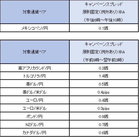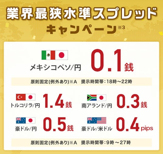 ※「業界最狭水準スプレッドキャンペーン」スプレッドの掲示時間帯:メキシコペソ/円は対象期間中の各営業日午後6時~午後10時、その他の通貨ペアは対象期間中の各営業日午前9時~翌午前3時