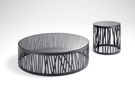 「8330」はガラスと金属の異素材を組み合わせた独創的なデザインのテーブルシリーズです。ブラック色のスモークがかかったガラス天板は12mmの厚みがあります。