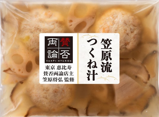 賛否両論 笠原将弘氏監修の「至福の和食シリーズ」から、出汁を効かせた具だくさんの椀物「笠原流つくね汁」を新発売します。既存のこだわりのお惣菜とセットにすることで、主菜・副菜・汁物が揃い、主食としてご飯をご用意いただければ一食分の献立ができあがります。つくねは、鶏肉の挽肉に慈姑(くわい)を混ぜることで、慈姑独特のサクッとした食感を楽しめます。昆布エキスに鰹節、あごだしなどを使用した和風のつゆで、香りづけにゆず皮も使用しており具材の鶏つくねや蓮根、椎茸の旨みをより一層引き立てています。さらに黒胡椒で味にアクセントをつけています。