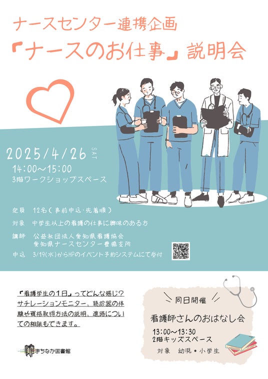 看護の仕事についてご紹介する「ナースのお仕事」説明会を、まちなか図書館で開催します。