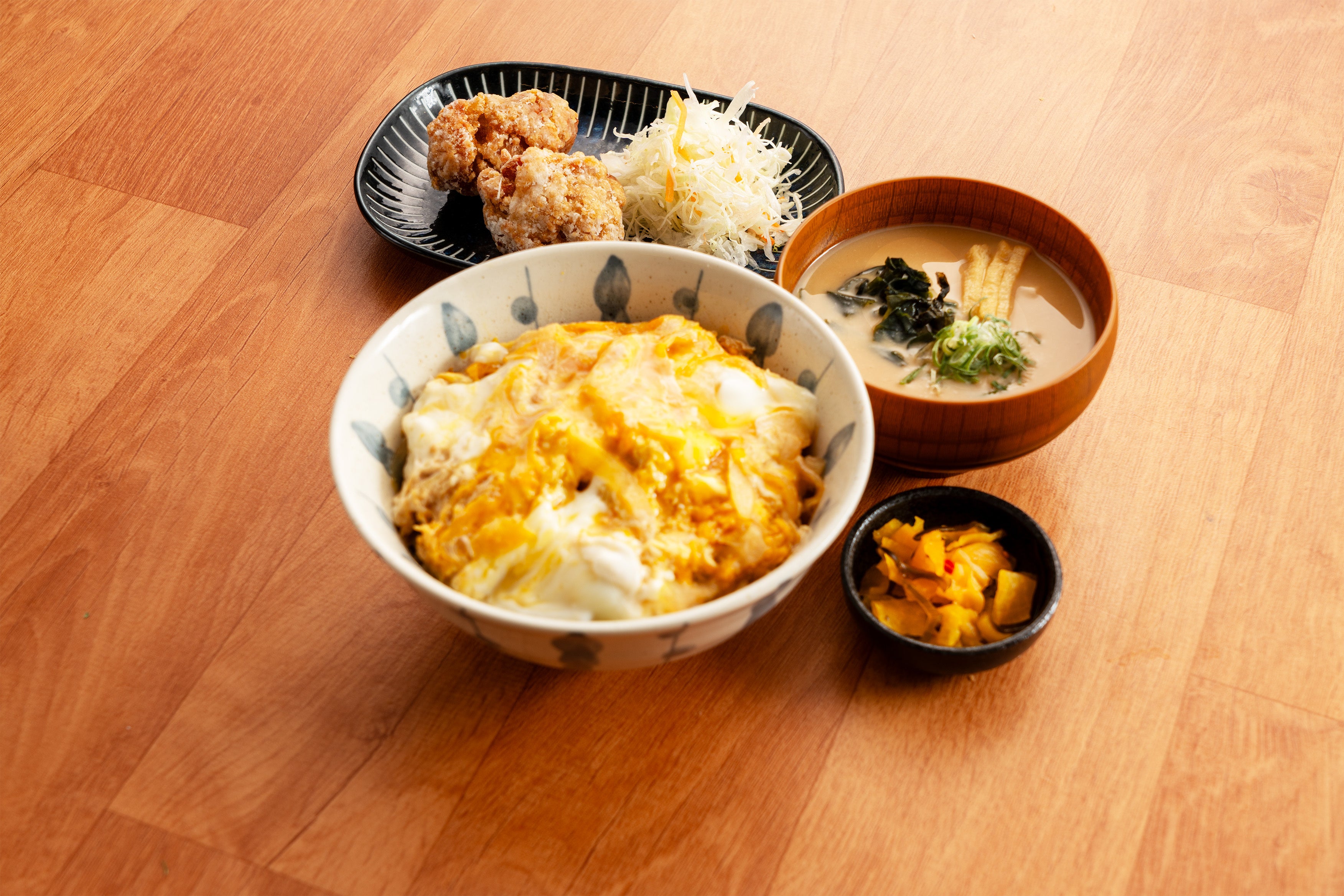 やさしいお出汁とトロトロ玉子のどんぶりと、鶏の唐揚げ2個のセットです。